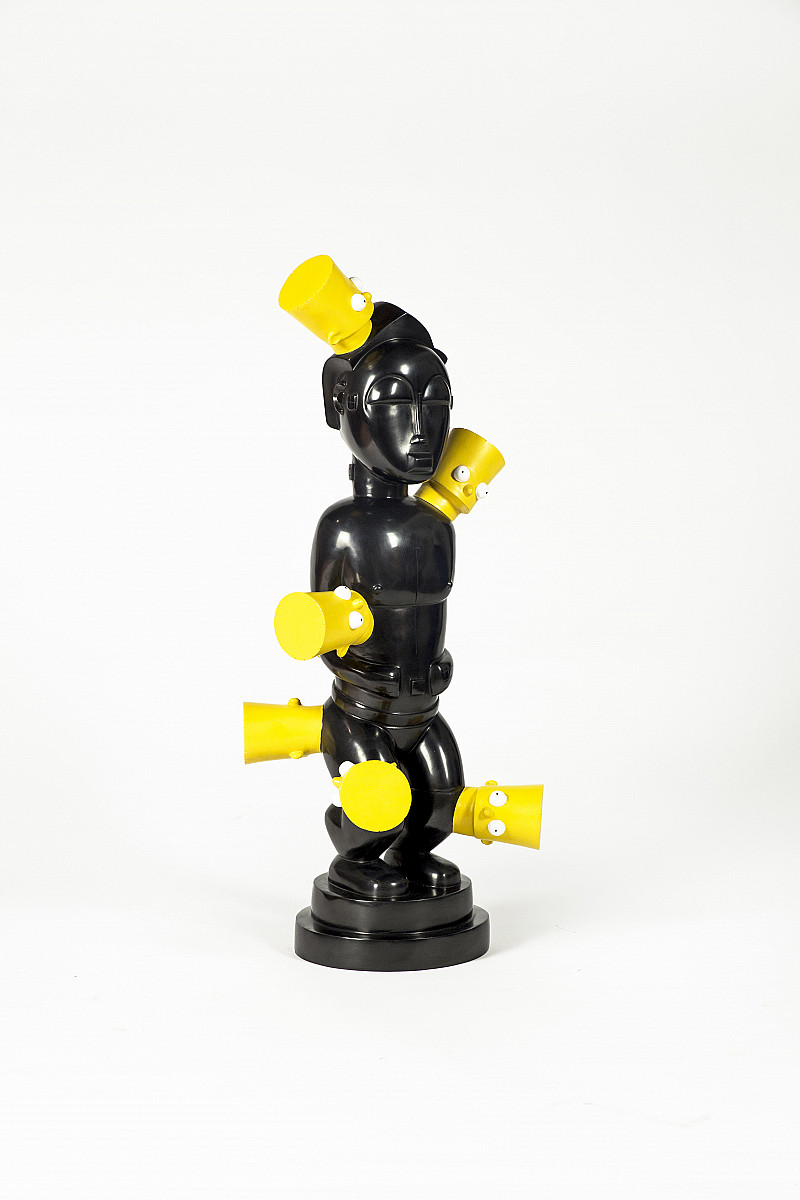 The figure of the cartoon character Bart Simpson is welded to a copy of an African curio in this maquette, which now stands in Cape Town as a large public sculpture called Africa.
