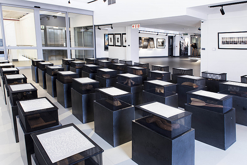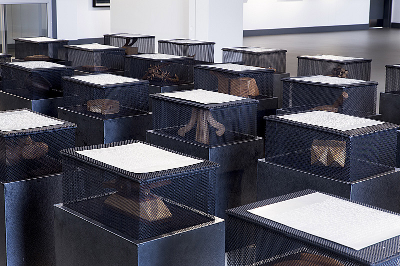 The installation works as a sensorial inversion: the blind are the only ones able to touch, interpret and access the objects on display, thus recontextualising the ability to ‘see’ a work of art. The work, in situ, appears like a kind of military graveyard, with rows of what might be tombstones neatly laid out. But in reality it functions as a massive dictionary of the objects concealed in the boxes, each beginning with a letter of the alphabet.