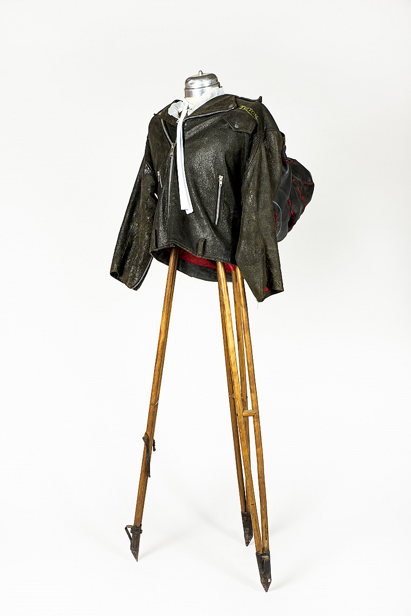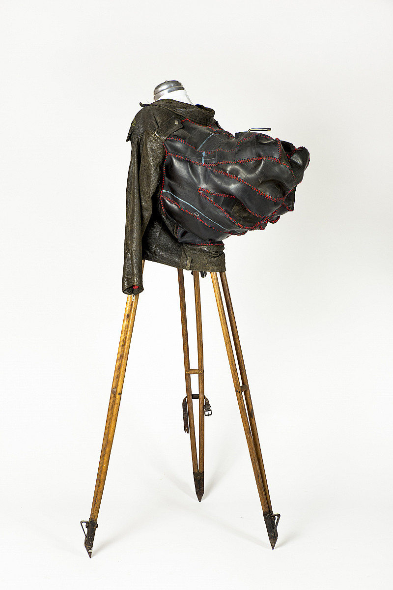 This sculpture comprises the parts of a costume that Hlobo wore for a performance entitled Igqirha Lendlela in which he wore a skirt made of men’s ties, a black leather biker jacket and a large rubber hump. He crossed Cape Town in this attire, going from Green Market Square to Khayelitsha. The hump suggests for Hlobo the burdens that people carry daily, but also the historical ‘baggage’ with which South Africans grapple as they try to forge a new country.