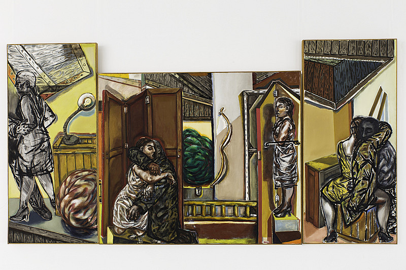 Inside Out, made in the tumultuous period before the demise of apartheid is, like several works from this period, filled with fear, anxiety and violence. Though there are apparently erotic liaisons depicted in the painting, they are juxtaposed with images of entrapment – the cloying interior spaces, the woman trapped in the box in the central panel – that convey psychological and social trauma.