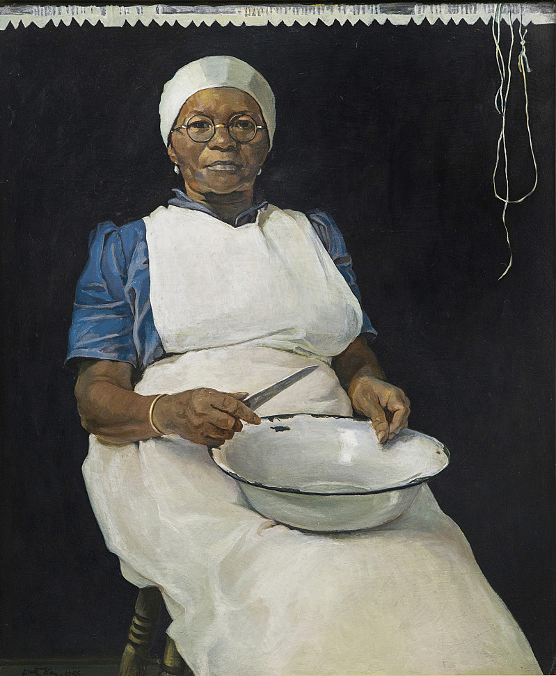 The subject matter, of a working-class woman, no doubt employed in a white household, is designed to be socially representative rather than serving as any form of social critique. The painting’s gentle lines and muted palette are typical of Kay’s mature style.