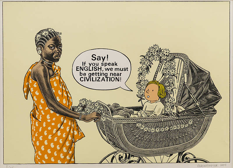 This complex lithograph was done at The Artist’s Press in White River, where Kannemeyer has often worked. As usual, Kannemeyer does not shy away from controversy and here he presents racial stereotypes (the white baby with the black nanny) in order to make fun of and critique prevailing racial and colonial attitudes in South Africa.