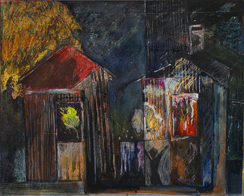 While aspects of this work certainly reflect ritual elements of Hinduism (the flame visible in each building, the bright red and yellow colours), the two buildings bear little resemblance to the ornate structures one might associate with Hindu temples. Instead, Thathiah gestures at the social and political landscape of South Africa at the time in which this work was produced.