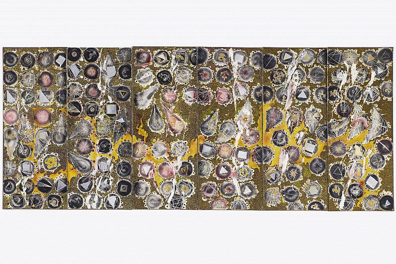 The Garden of Delights was made during a fertile creative period in Coetzee’s career. His experiments with ‘informalism’, and an initial trip to Japan in 1960, had led him to the Gutai group of experimental painters, with whom he would exhibit in Osaka in 1960. A painting from this collaboration would later be shown at the Art of Assemblage show at MOMA in New York.