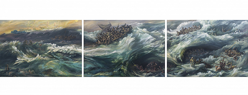 This remarkable triptych depicts the greatest nautical disaster in South African maritime history. The SS Mendi, carrying 823 members of the 5th Battalion the South African Native Labour Corps, sank en-route to France on 21 February 1917. 607 black South African troops, bound for service in France during World War I, died in the event.
