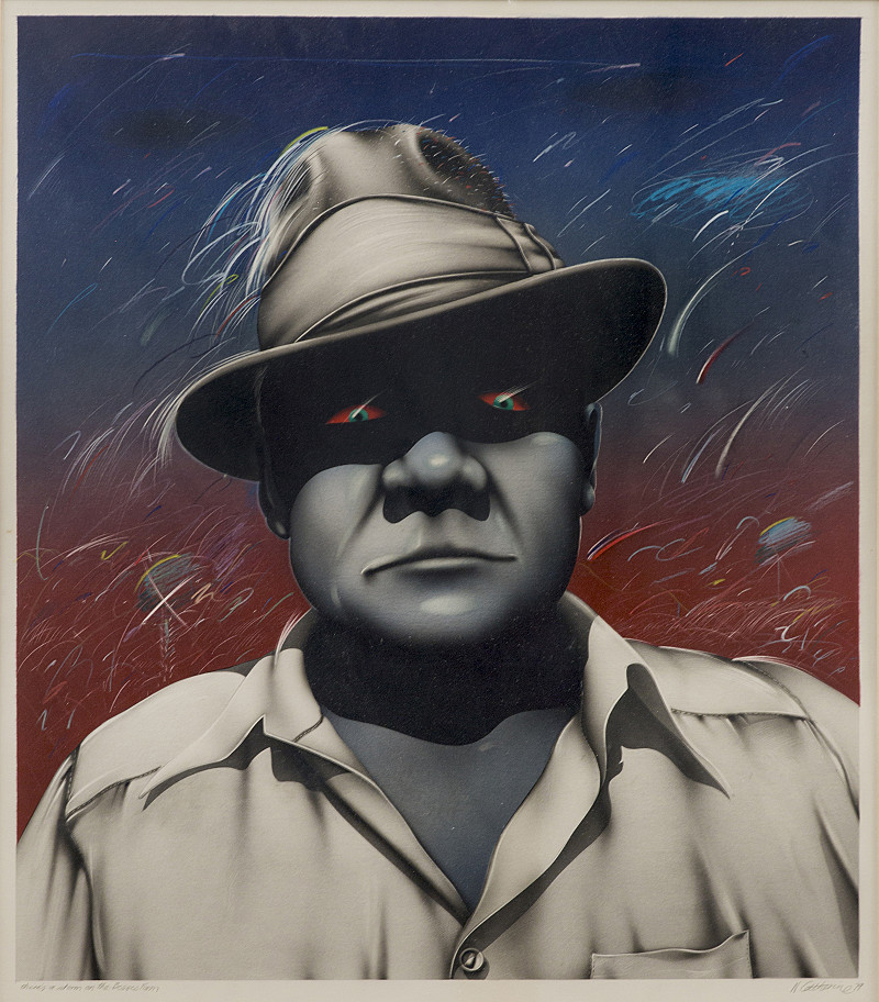 This portrait of a man with his typical khaki shirt and farmer’s hat takes a stab at the figure of the conservative farmer in apartheid South Africa.