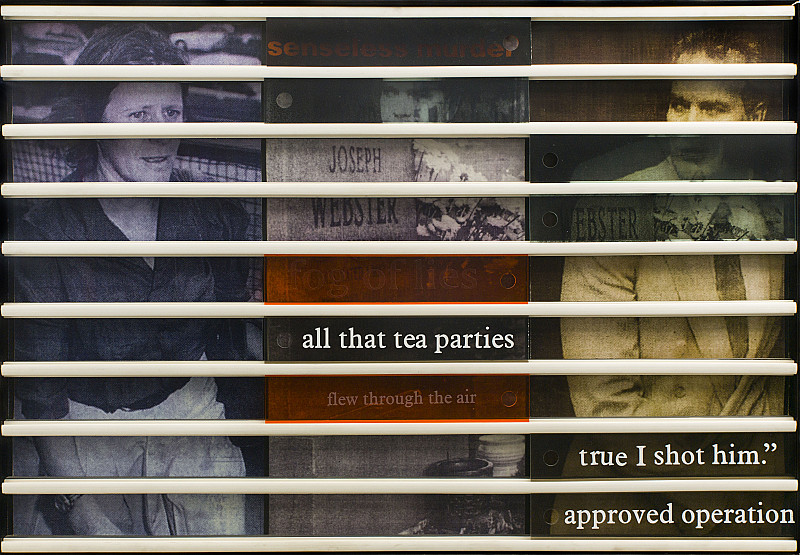 The viewer must slide the wooden slats across the work to see what is hidden beneath, as though the truth itself remains partially obscured.