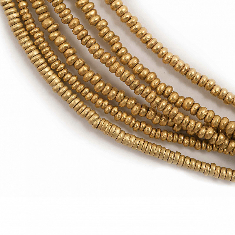 An estimated 12 000 gold beads were sorted and grouped into 139 gold necklaces are now safely embedded within inert foam for display. For the purposes of practical conservation and curation, the beads were sorted, categorised, grouped and strung together. Surgical suture string was chosen to conform to the inside diameter of the beads. The gold bead necklaces were closed by a custom-made brass crimp, which hold the two loose ends of the thread together. Gold beads were found individually but no gold necklaces as such were excavated. Their current form is solely for stability purposes.