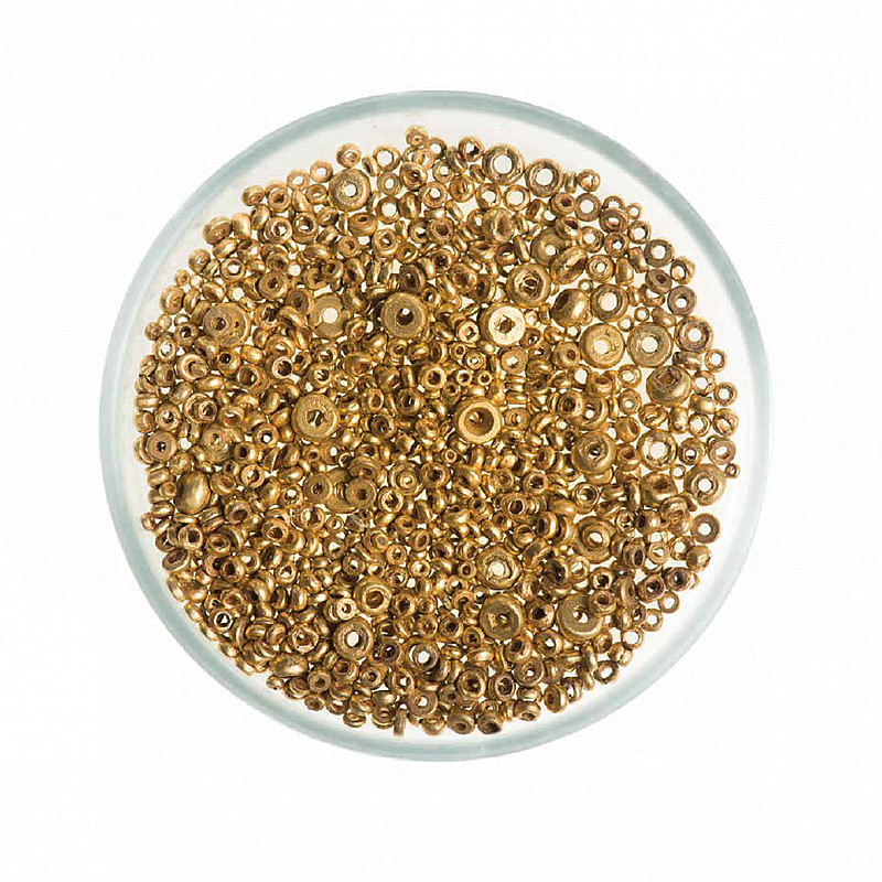 Thousands of loose gold beads have been excavated from the burial area on Mapungubwe Hill. They were recovered individually and none of them were found strung. Bead fabrication research indicates that some gold beads were disc-like and others globular and punched with deliberately smoothed holes. Some gold beads were flattened and shaped after an annealing treatment, and were then most likely