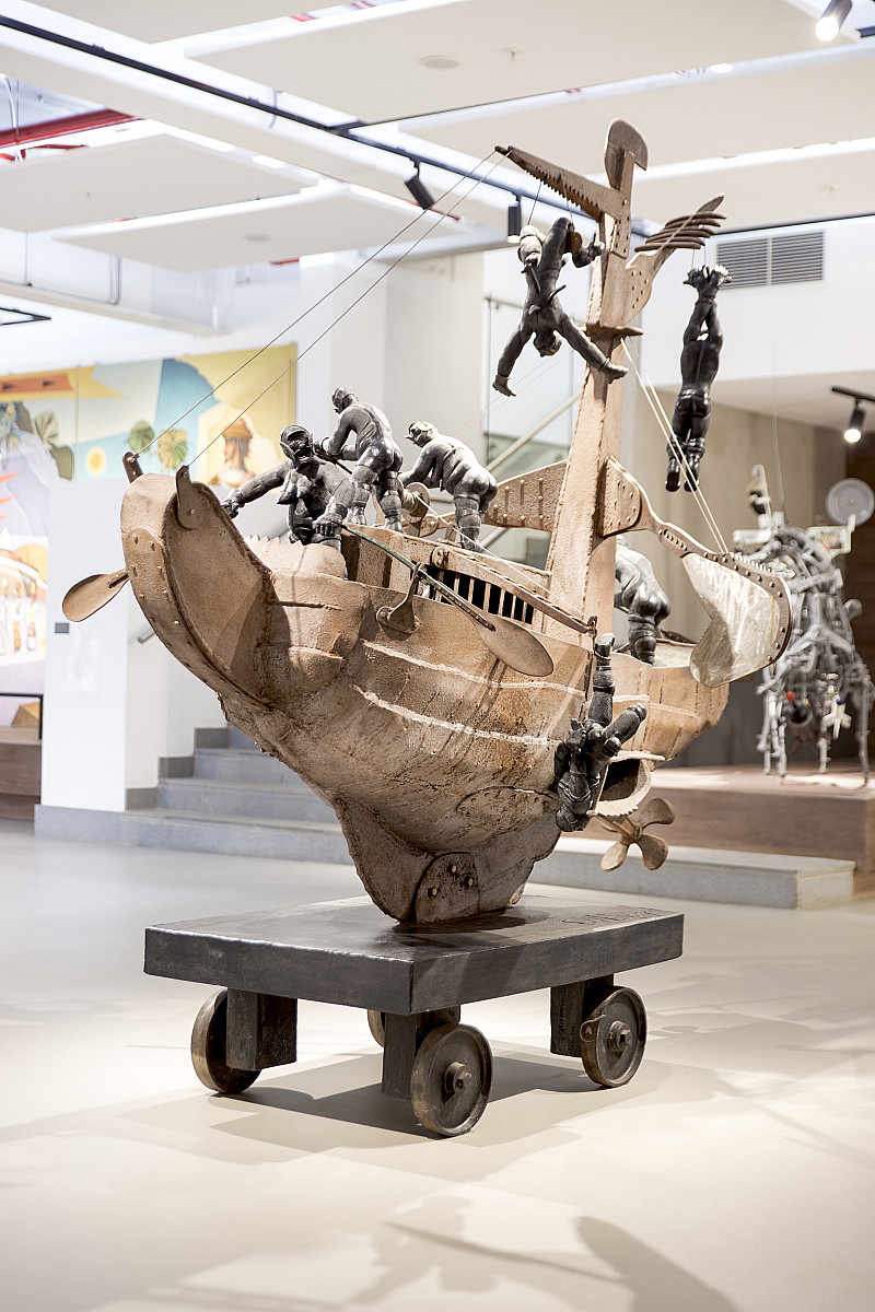 These works all took the idea of the sea as the central theme, but in keeping with Brown’s rollicking satirical approach, the voyages are all on the mythical Ship of Fools. They also reference the slave ships and vessels of the colonial explorers. His ships, while peopled with sailors and human cargo, are broken hulks, unfit to take to sea.