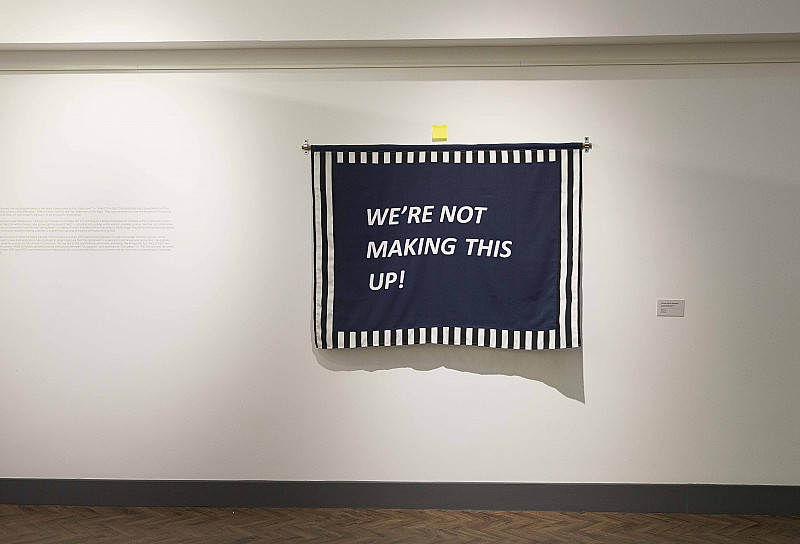 A fabric work that also functions as a banner, created by Simnikiwe Buhlungu, titled and reading ‘WE’RE NOT MAKING THIS UP!’ (2016).