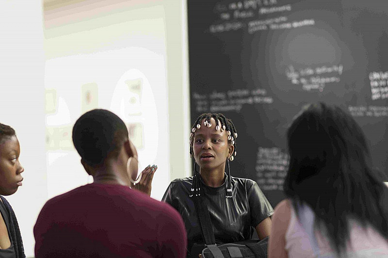 Artist and All in a Day's Eye... researcher, Donna Kukama, speaks to workshop participants about her research and texts included in the exhibition.